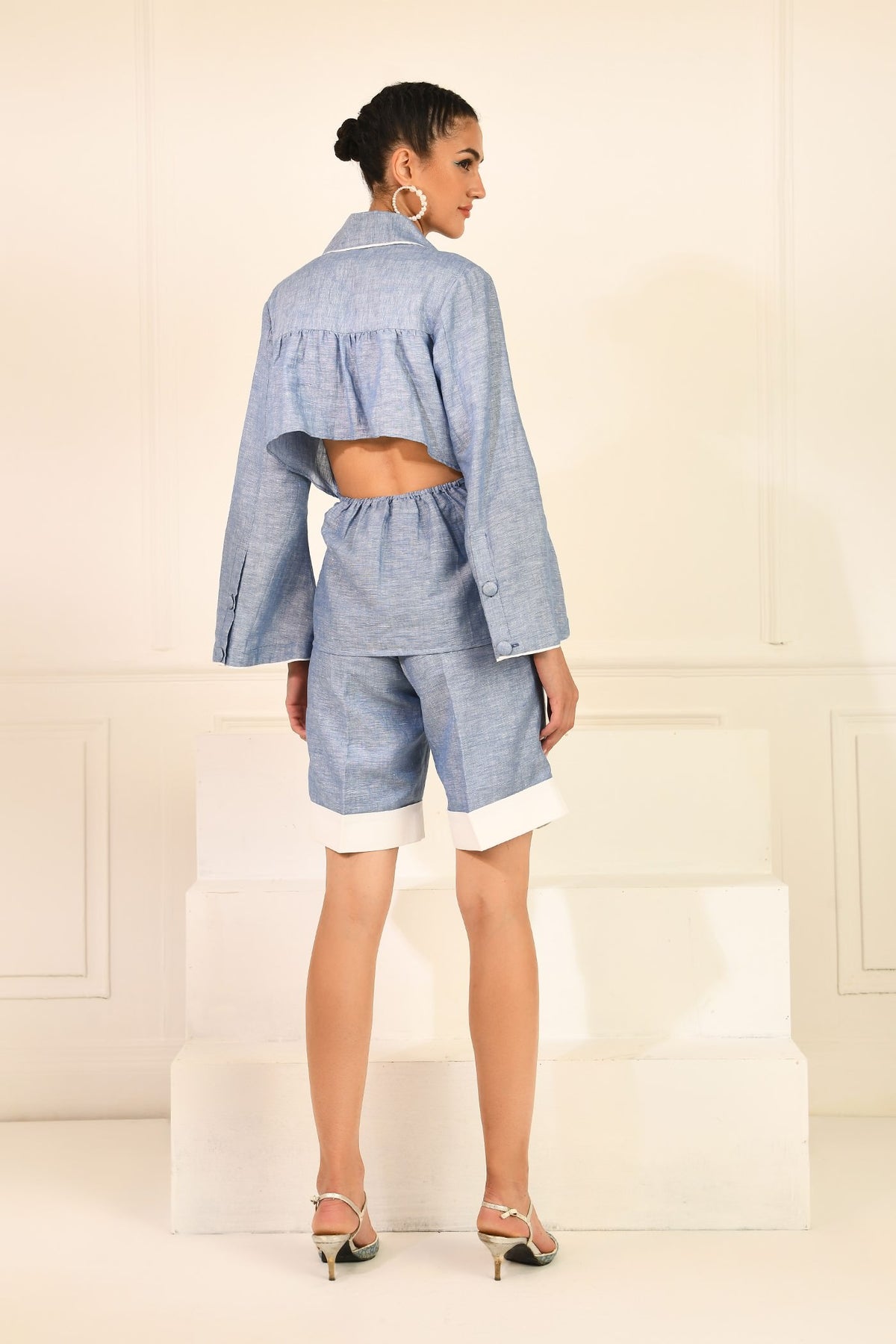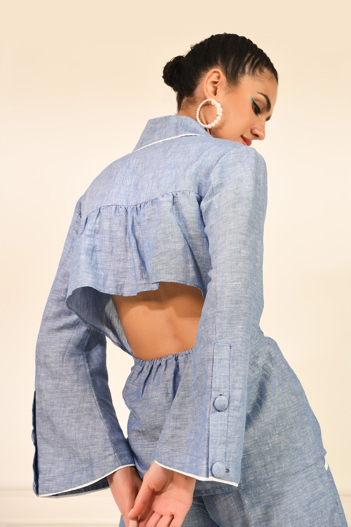 A blaze of freshness, Blaze is not your regular blazer. The white cotton detailing and the cut out ruffled back is to die for !