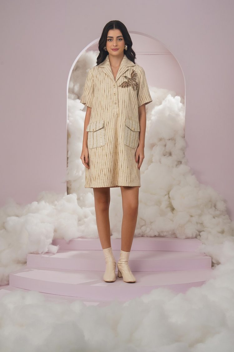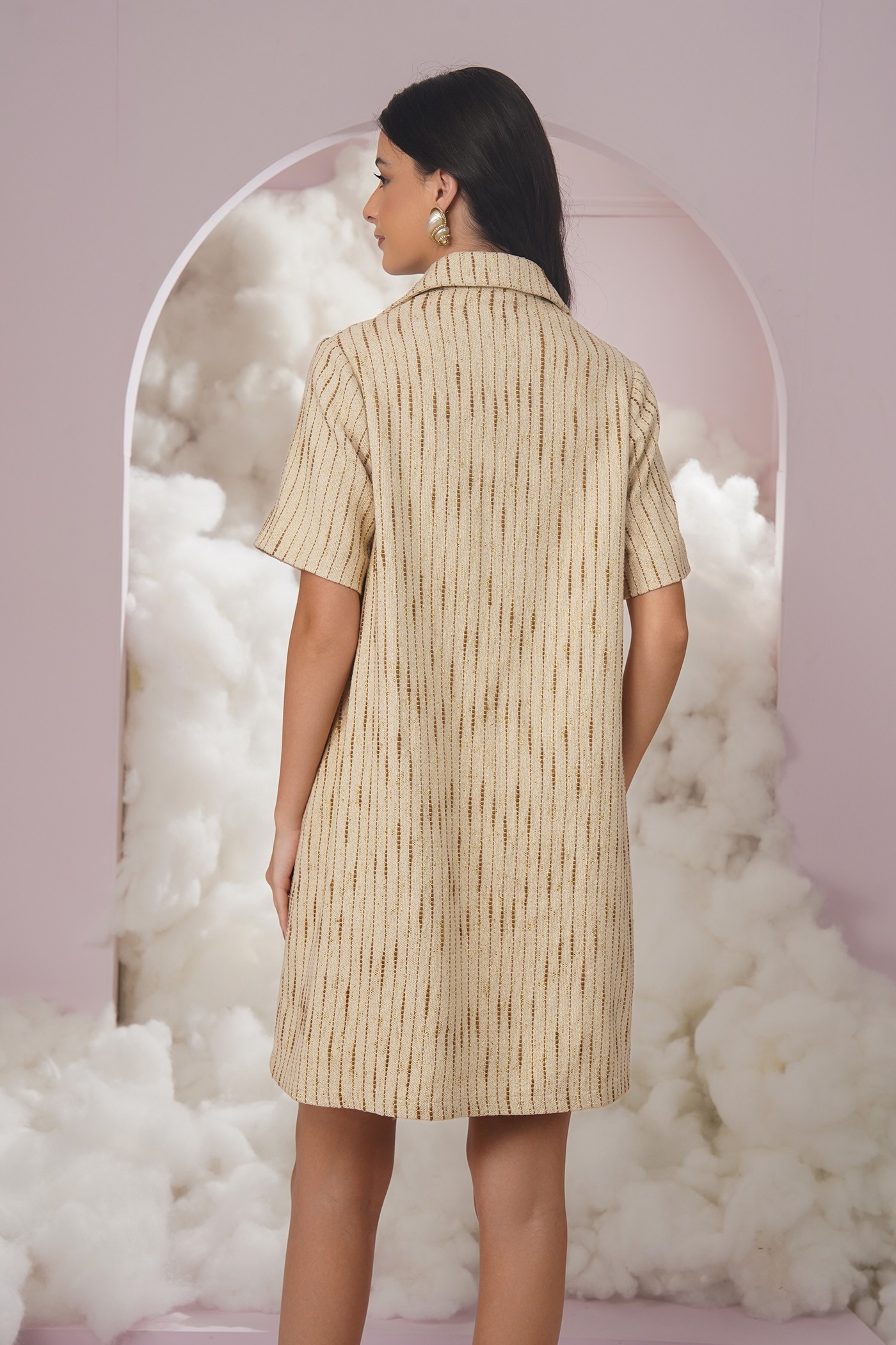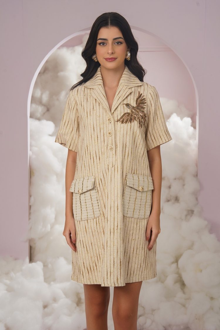 The “”Don’t Stop”” shirt is a stunning blend of ivory and gold, exuding elegance and luxury.
