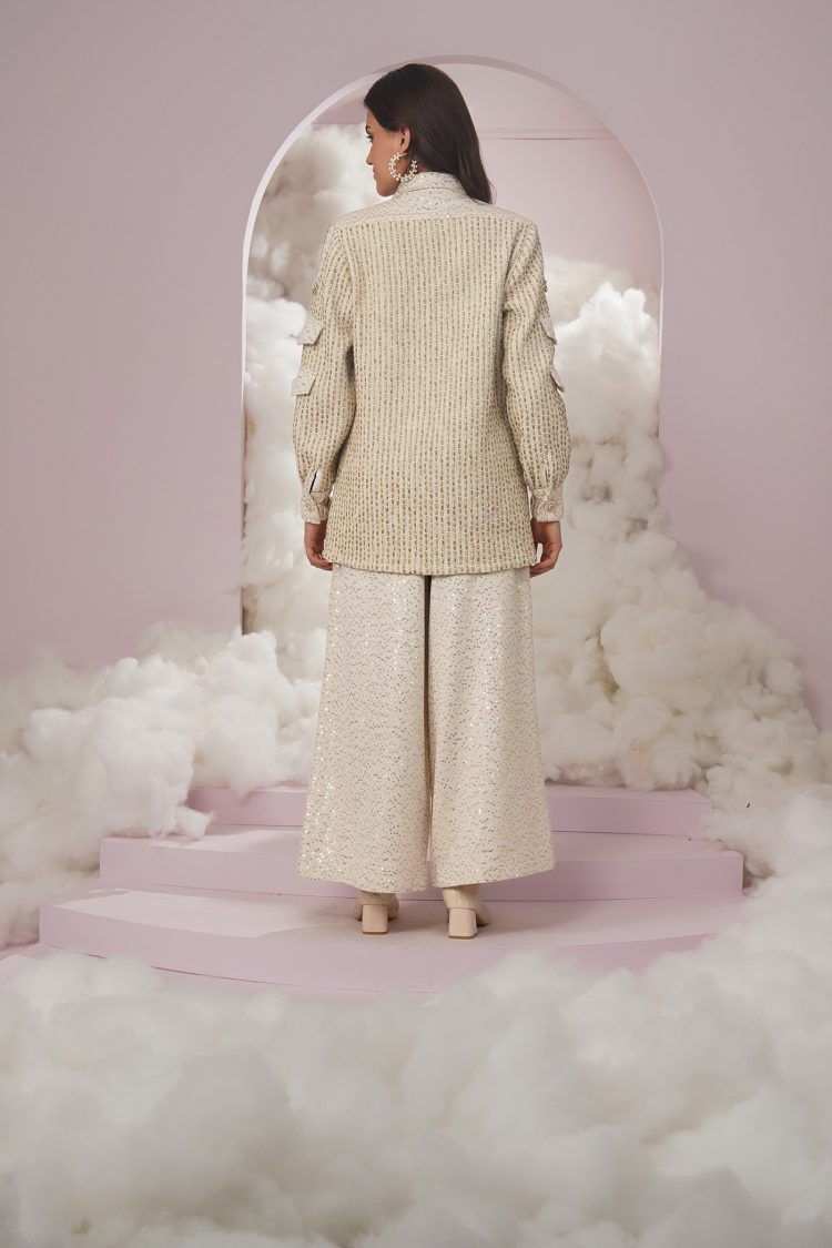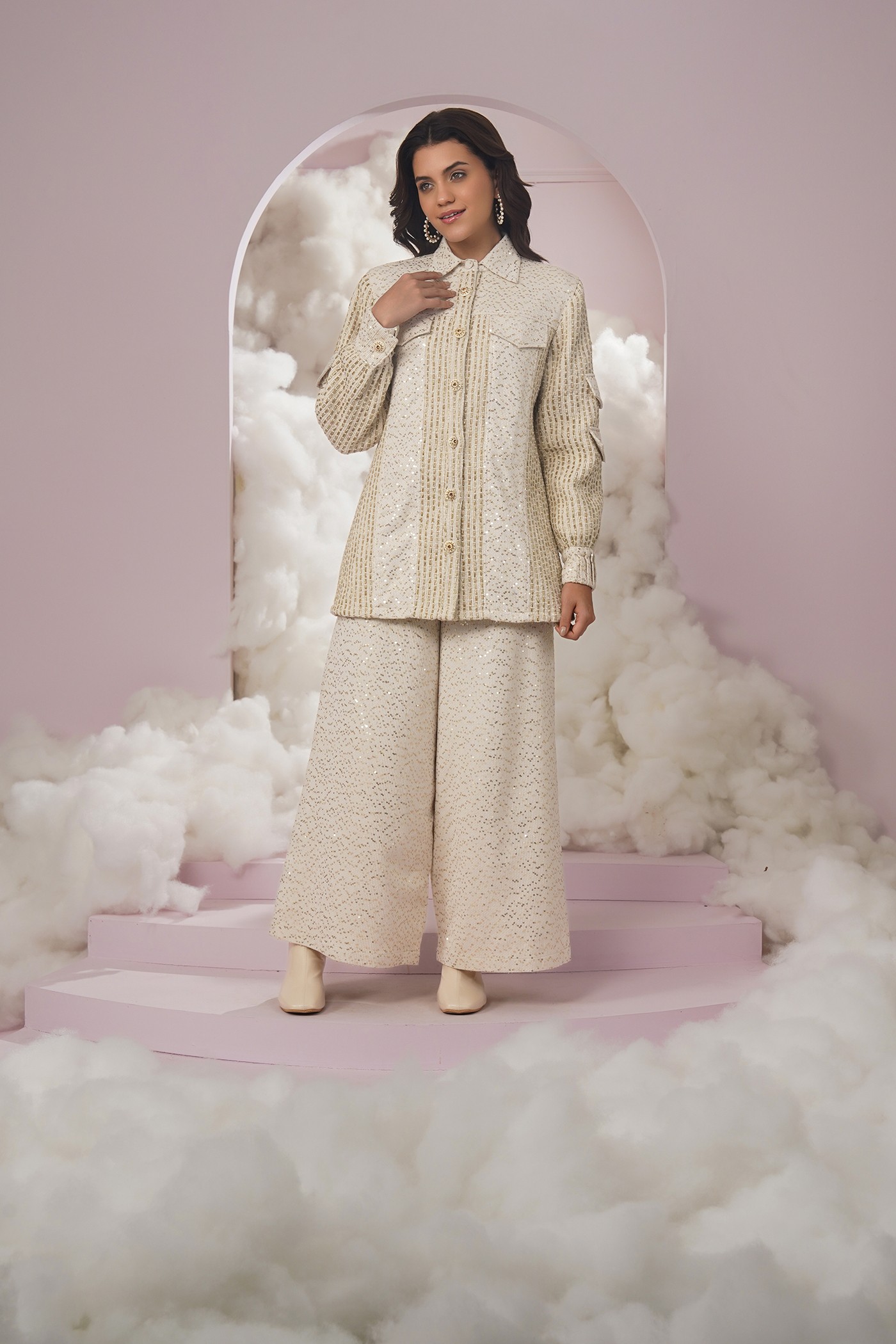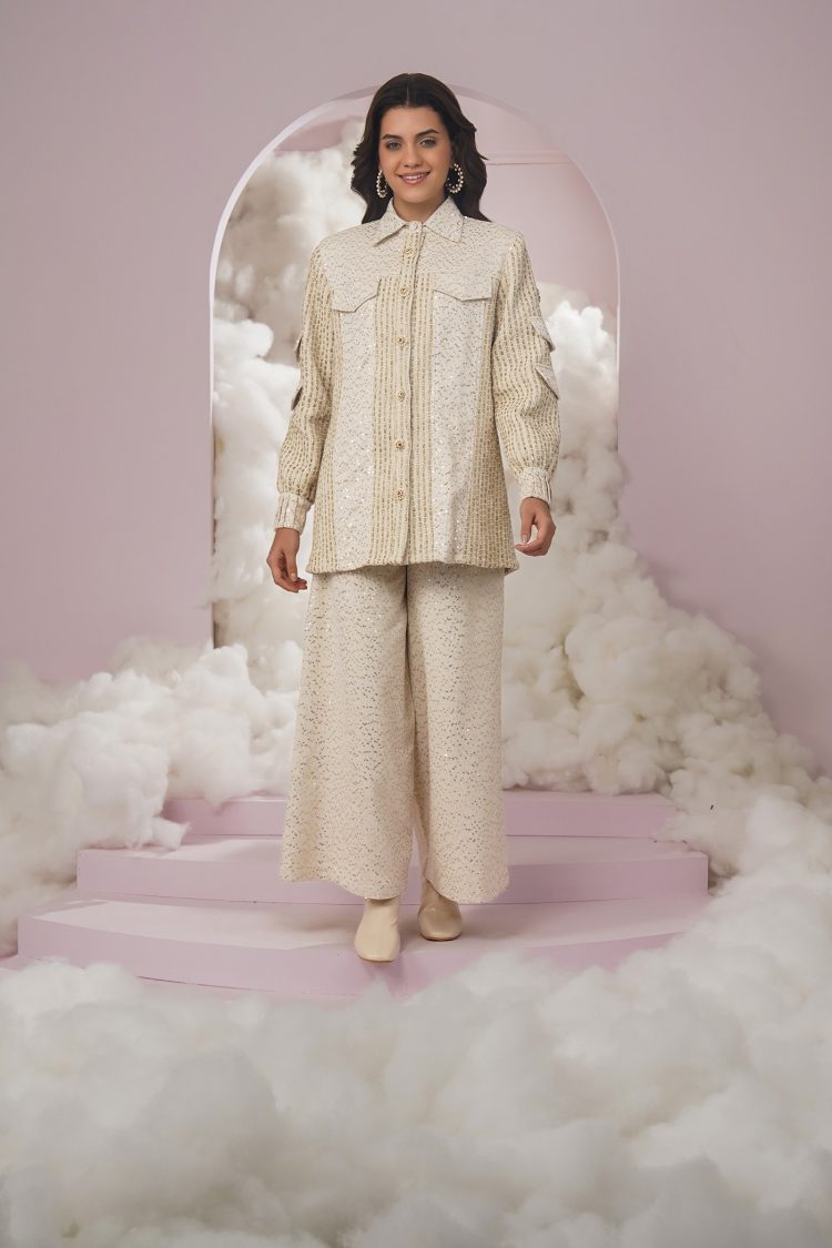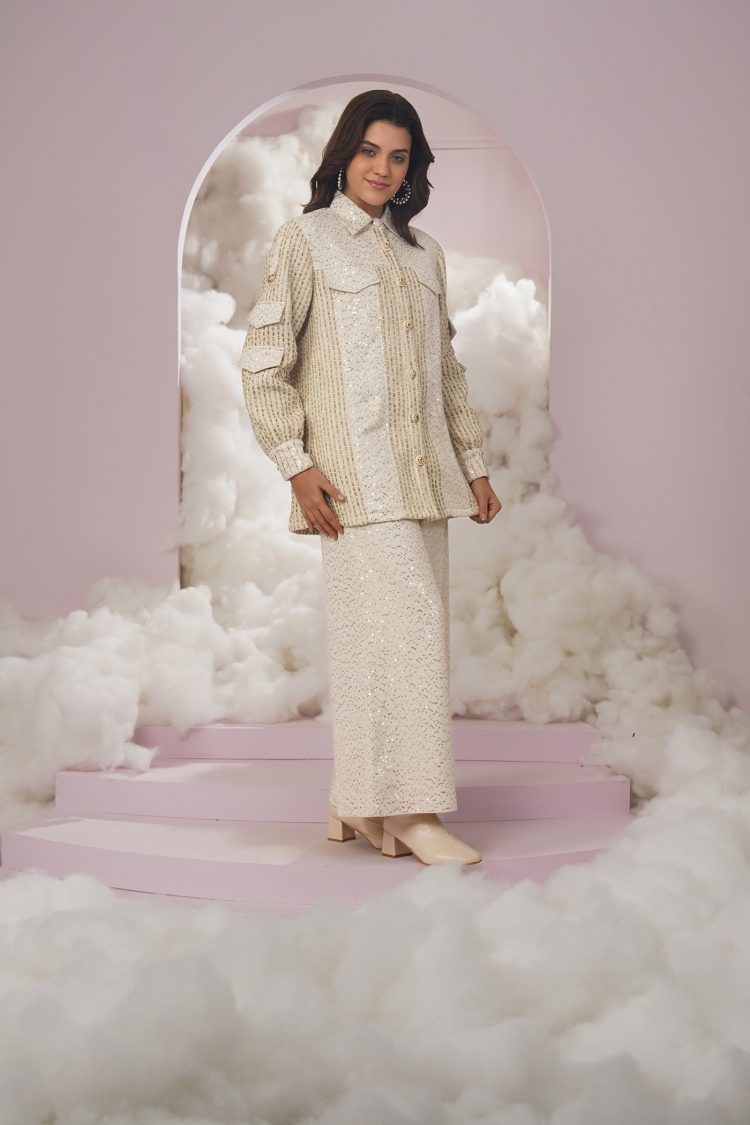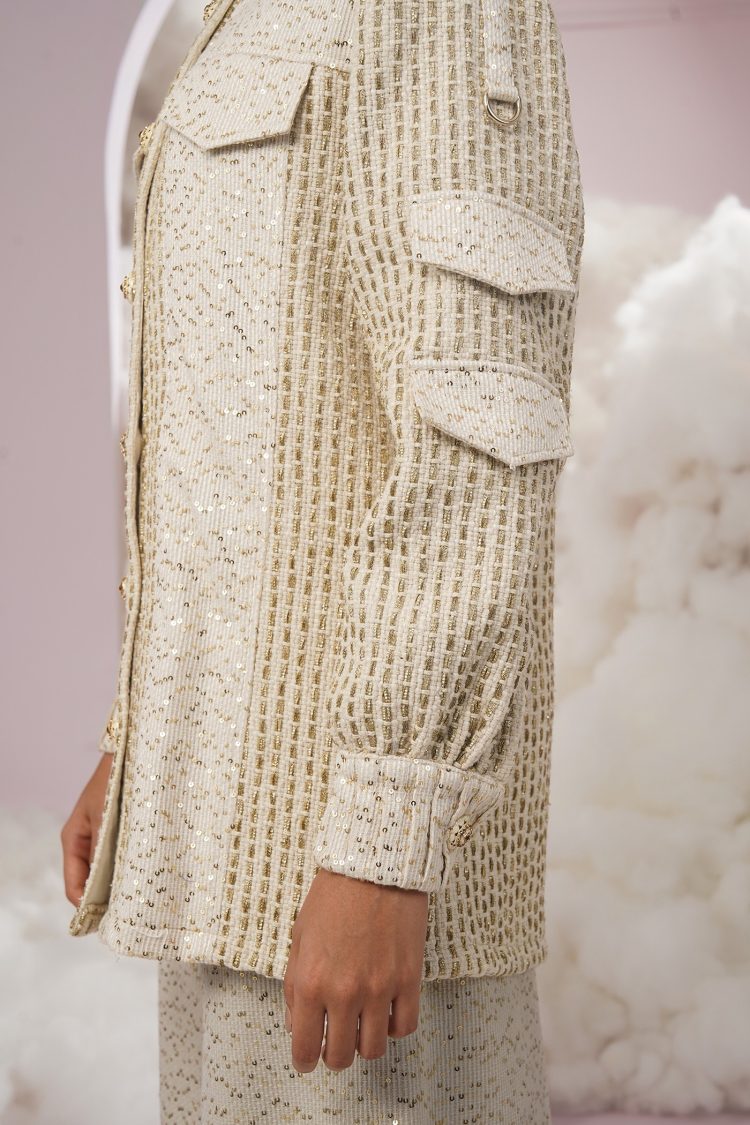 The “”Don’t Stop”” shirt is a stunning blend of ivory and gold, exuding elegance and luxury.