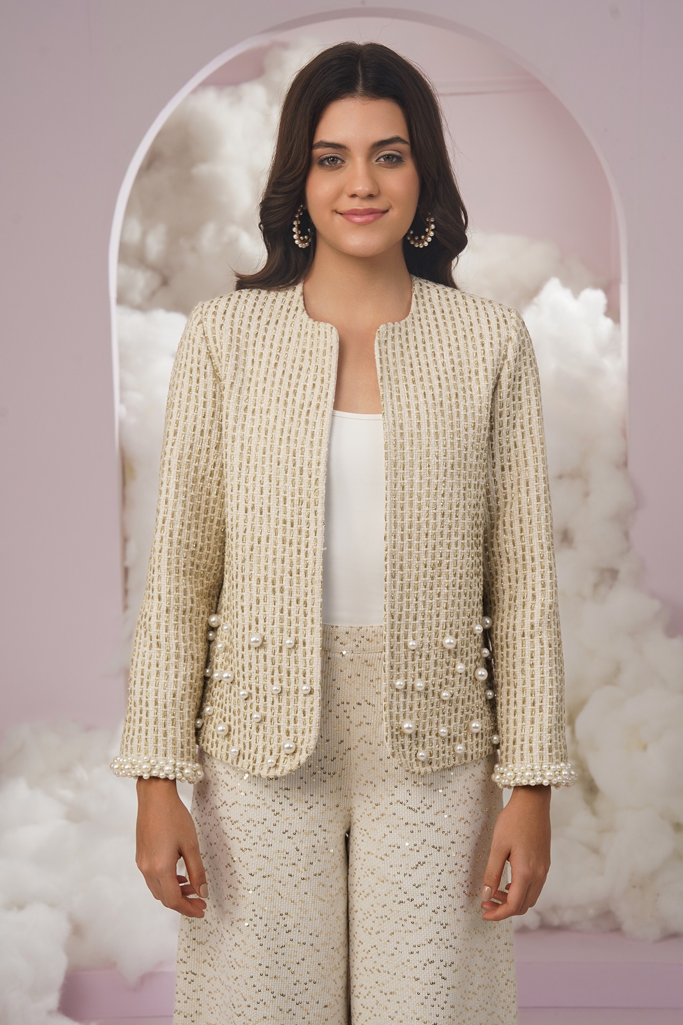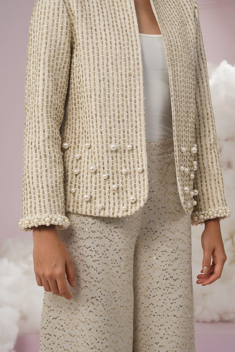 The “”Don’t Stop”” shirt is a stunning blend of ivory and gold, exuding elegance and luxury.