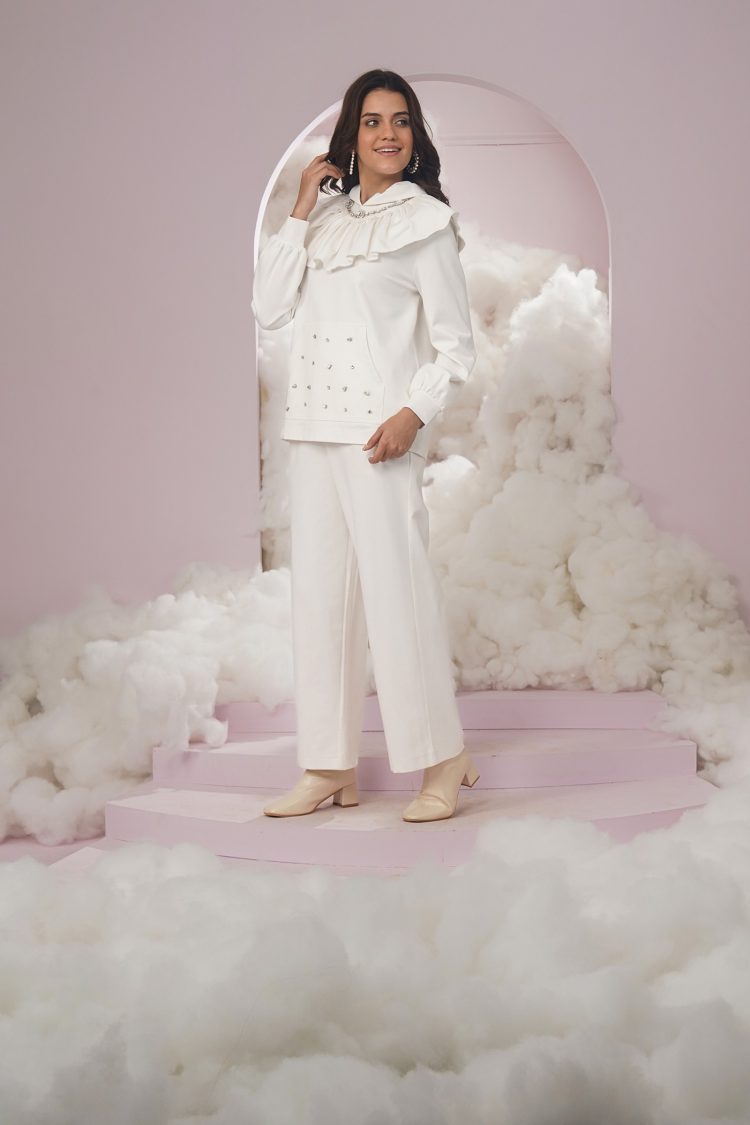 Icy pastel colors are a treat for the eyes, aren’t they?? Demi kaftan shirt comes with a matching inner. She is super cute and has an assymertrical ruffled arm.