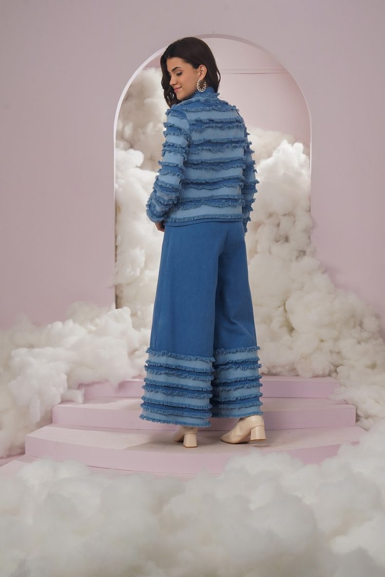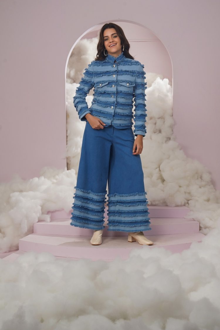 A true gem ! Gem will be your bestfriend, Pin tucked to perfection, the sleeves are to die for. The delicate lace on the collar cape adds elegance to this entire piece It comes in 2 colors – Blue and white.
